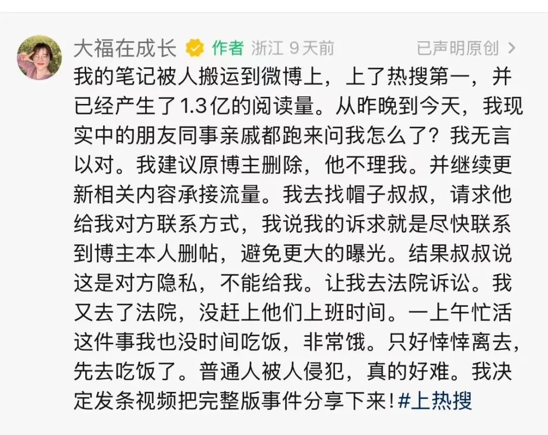 面对汹涌的网络暴力,“大福”最终选择报警,并在社交平台发布声明,要求搬运者删除视频、停止侵权。但即便如此,她的生活已无法回到从前,现实社交关系也因舆论压力变得紧张。